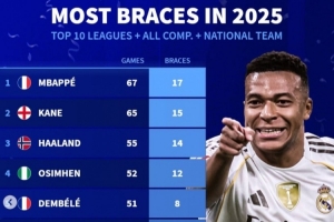 体育资讯1月3日讯 2025年已经过去,《转会市场》也统计了2025年前十联赛球员的俱乐部+国家队各项赛事双响次数和戴帽次数,姆巴佩同时领跑双榜。