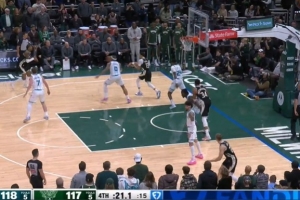 当时裁判没有吹罚,字母哥接球后分球给库兹马,后者命中反超三分!