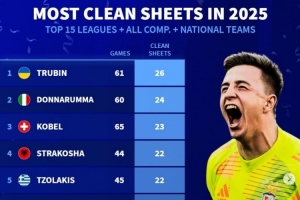 体育资讯1月4日讯 《转会市场》统计了2025年前15联赛的门将在俱乐部+国家队各项赛事总零封场次榜,特鲁宾力压多纳鲁马居首。