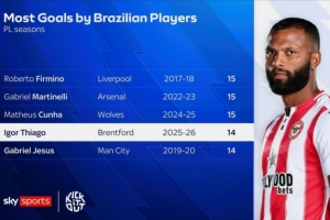 体育资讯1月5日讯 英超第20轮比赛,伊戈尔·蒂亚戈上演帽子戏法,帮助布伦特福德客场4-2击败埃弗顿。天空体育指出,伊戈尔·蒂亚戈本赛季英超打进14球,有望打破巴西球员单赛季英超进球纪录。