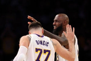 今日湖人球员东契奇(36分)、詹姆斯(26分)、拉拉维亚(26分)连续第二场比赛同场砍下20+。