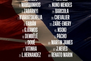 前锋:7-克瓦拉茨赫利亚、 9-贡萨洛·拉莫斯、10-登贝莱、14-杜埃、29-巴尔科拉