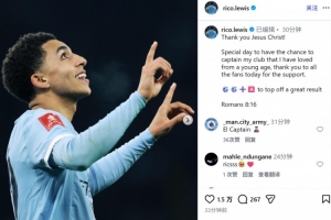 体育资讯1月11日讯 曼城在本轮足总杯10-1大胜埃克塞特城,里科·刘易斯在本场比赛中接过了队长袖标并且独造3球。