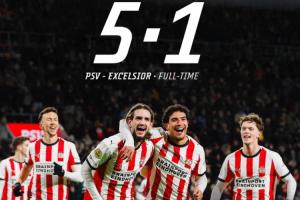 体育资讯01月11日讯 荷甲第18轮,埃因霍温5-1大胜SBV精英,在荷甲联赛豪取12连胜。