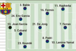 体育资讯1月11日讯 北京时间明天凌晨,巴萨将在西超杯决赛中对阵皇马,《阿斯报》预测了巴萨此役的首发阵容。