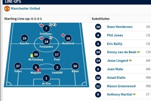 替补席则是:迪恩·亨德森、菲尔·琼斯、拜利、范德贝克、林加德、马塔、阿玛德、格林伍德、马夏尔。