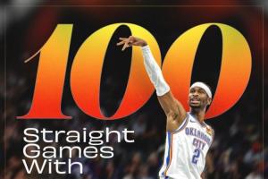 这也是亚历山大连续100场至少得到20分,继续追逐NBA历史第一的张伯伦(126)。