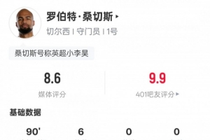 体育资讯1月18日讯 英超第22轮,切尔西2-0布伦特福德。本场比赛,蓝军首发门将罗伯特·桑切斯表现出色,贡献全场最多的6次扑救,评分8.6全场最高。