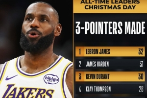 随着今天比赛中詹姆斯投进一记三分,他生涯圣诞大战三分命中数达到32记,超越哈登(31记),独占圣诞大战历史三分王。而杜兰特今天命中4记三分,升到了第三位。贾马尔·穆雷(今天命中9记)和霍福德的排名也有变化。而前十中,除了雷迪克,其余均为现役球员。