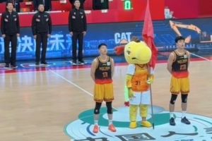 CBA常规赛第十七轮南通赛区江苏肯帝亚vs新疆伊力特,奏唱国歌环节,球员闫实、刘泽希领唱国歌。一起为肯帝亚男篮加油助威!