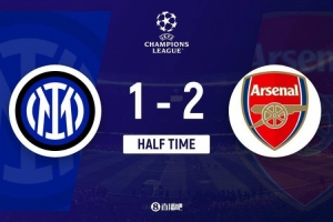 上半场伤停补时1分钟,半场结束,国际米兰暂1-2阿森纳。