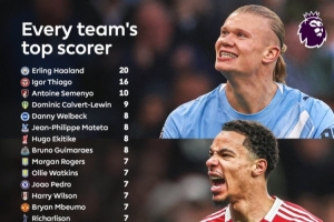 体育资讯1月24日讯 英超官方列本赛季各队联赛射手王,曼城哈兰德、切尔西若昂·佩德罗、曼联姆伯莫、阿森纳约克雷斯+特罗萨德、利物浦埃基蒂克、热刺里沙利松。