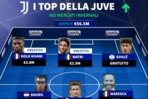 阿根廷小将苏莱也进入了这个最佳冬季引援阵容,他在2020年1月加盟尤文青训,2024年7月以2650万欧元转会到罗马,为尤文获得了丰厚的资本收益。上赛季尤文还在冬季转会期花费360万欧元租借了中锋穆阿尼,他为尤文最终获得欧冠资格起到了重要作用。