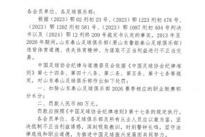 足协官方公布对泰山的处罚决定,2013年至2020年期间,山东泰山违背体育道德、丧失体育精神、为谋取不正当利益进行不正当交易,扣除2026赛季积分6分、罚款人民币80万元。