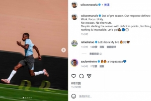 马纳法昨晚更新社媒写道:结束季前备战,如何回应将定义我们。努力、专注、团结,没有借口,没有捷径。尽管负分开局,但对这支队伍来说,一切皆有可能,加油。他的队友拉唐、米内罗现身评论区鼓励。