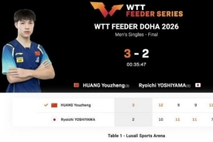 体育资讯2月1日讯 WTT支线赛多哈站男单决赛,黄友政3-2战胜吉山僚一,夺得冠军!