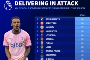体育资讯2月18日讯 《转会市场》统计了本赛季英超各队中锋+边锋进球情况,伯恩茅斯力压布伦特福德居首。