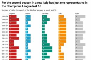 体育资讯02月26日讯 TA统计了自03/04赛季以来五大联赛晋级欧冠16强的球队数量。其中,近2个赛季均仅1支意甲球队晋级16强。