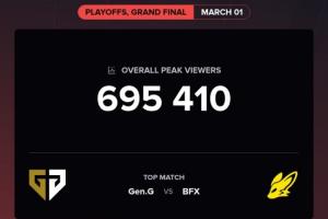 体育资讯03月02日讯 数据网站公布了昨日2026LCK Cup总决赛GEN vs BFX的直播热度情况,本场Bo5观众峰值只有69.5w,连去年同期决赛热度的一半都不到。