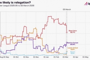 体育资讯3月5日讯 本赛季英超保级争夺战日趋激烈,数据网站OPTA分析了目前15-18名球队在本赛季降级概率走势情况。