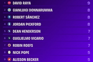 体育资讯1月2日讯 Squawka统计了本赛季的英超零封榜,阿森纳门将拉亚第一。